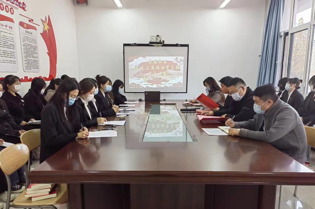 为深入学习宣传贯彻党的二十大精神,创新党建工作新形式,落实“一站式”学生社区综合管理模式建设,11月2日,管理工程学院党委召开荷园社区东区三公寓临时党支部成立大会暨学习宣传贯彻党的二十大精神主题党日活动。校机关党委副书记王国华,管理工程学院党委书记李洪民、副书记王中帅及荷园社区东区三公寓全体党员出席大会。会议由社区临时党支部书记、辅导员郭纯孜主持。