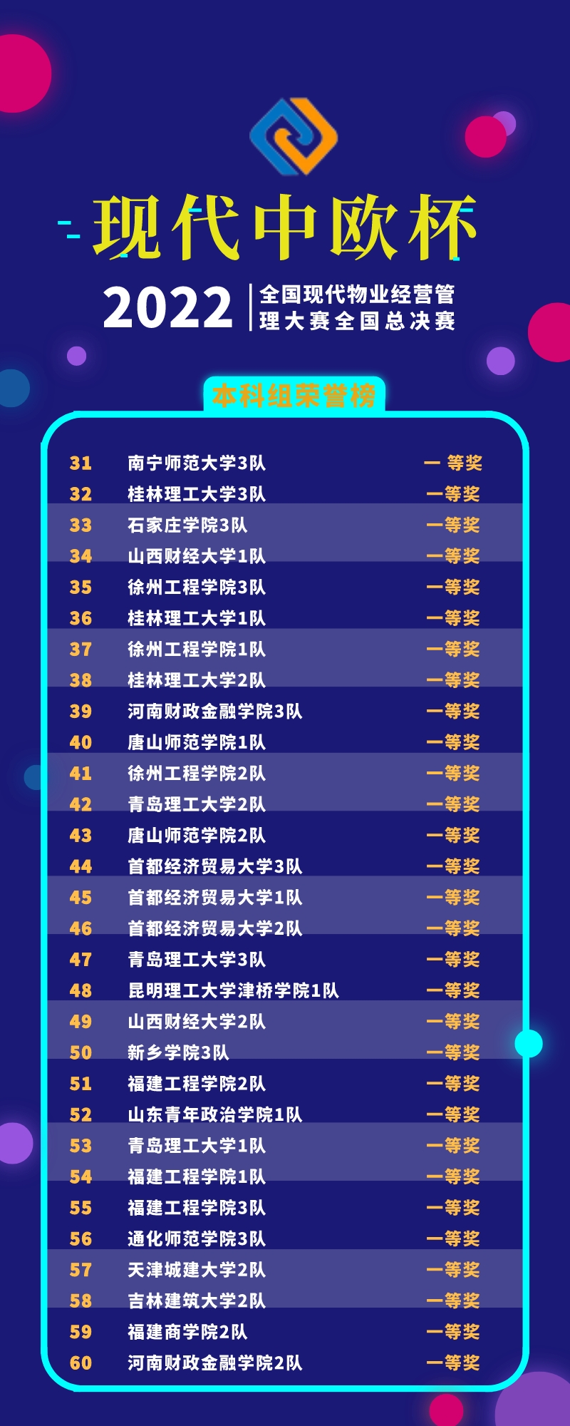2022年11月5日,由中华全国总工会劳动和经济工作部指导,中国执业经理人协会主办,中国职业经理人协会物业经理人分会、北京现代中欧软件开发有限公司、石家庄学院承办的2022年“现代中欧杯”全国现代物业营管理大赛全国总决赛落下帷幕。经过为期五个月的激烈角逐,我校参赛团队再创佳绩,青岛理工一队(队员:李蓝天、肖贵荣、刘家铨,指导老师:李萌萌、周凯),青岛理工二队(队员:王彬旭、庄城、陈佳慧,指导老师:马莲欣、李萌萌),青岛理工三队(队员:闫吉奎、张若娇、乔文琰,指导老师:郭平、马莲欣),三支队伍均进入全国冠军赛并荣获全国一等奖。