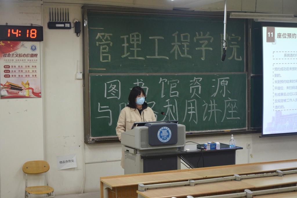 11月15日,管理工程学院于主教学楼B211教室举办“图书馆资源与服务利用”讲座。本次讲座邀请到图书馆阅览部孙雨晴老师主讲,讲座采取线下讲解和线上直播的方式进行,吸引了学院数百余名不同年级的学生聆听与观看。