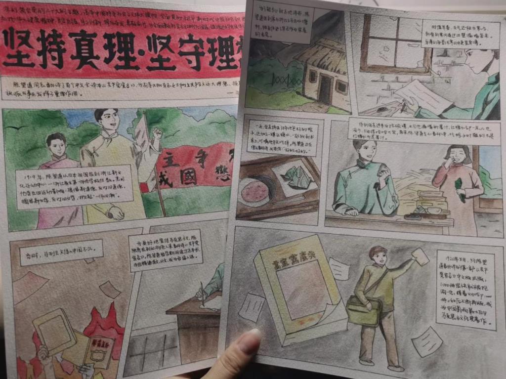 学校五四红旗团支部、经贸203班团员青年们则用画笔画出自己对马克思主义中国化时代化的理解。经贸203班团支书苗渝舒说:“推进马克思主义中国化时代化是一个追求真理、揭示真理、笃行真理的过程。我们必须把握好习近平新时代中国特色社会主义思想的世界观和方法论,用马克思主义科学理论指导我们的学习和实践。”