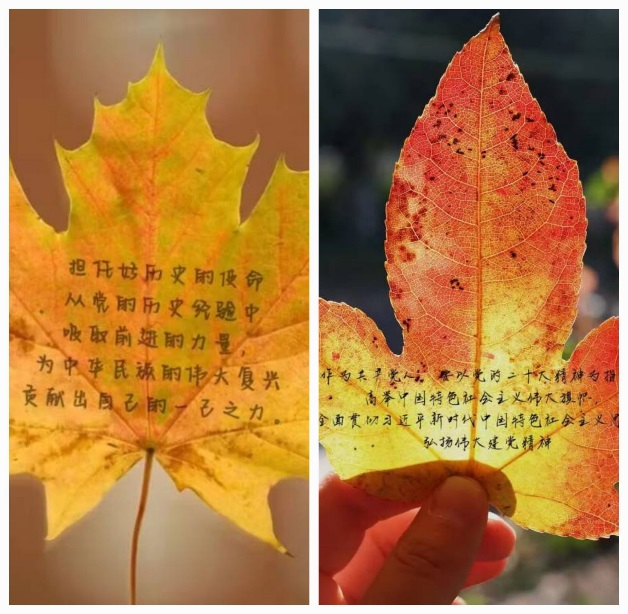 财管212班团支部则通过多种形式开展党的二十大精神学习,团支书骆雨菲组织团支委共同录制“学思践悟二十大,砥砺奋进新征程”主题微团课,带领全班同学学习领会党的二十大精神。召开“讲讲家乡新时代十年新变化”主题团课,组织来自10个省份的同学讲述自己的家乡在党的领导下实现内涵式高质量发展的故事。来自江西上饶的汪佳庆同学说:“正是在我们党的正确领导下,家乡的八一大桥从过去的断壁残垣到如今的车水马龙,帮助上饶发展驶入了快车道。”班级同学则将对党的爱与祝福写在秋叶上,以此来表达对“中国式现代化”的美好憧憬,以及青年人投身于实现中华民族伟大复兴中国梦的坚定决心。热爱软笔书法的刘佳同学则提笔写出内心的学习感受:“江山就是人民,人民就是江山。中国共产党领导人民打江山、守江山,守的是人民的心”。
