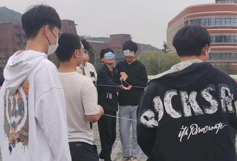首先开始的是破冰游戏“造房子”,每组一根白绳,在遮住双眼的情况下,队友间互相配合,用白绳摆出各种形状,欢声笑语间,疏离感也逐渐被热情融化。“心有千千结”游戏中,同学们看清双手边的人后松开手在音乐声中自由走动,当主持人叫“停”时,伸手去拉住原来左右手两边的伙伴,从而形成许多交互错杂的“手结”且不松手,但可以钻、跨、绕、转以回复到起始状态,同学们搞怪的动作不禁让人捧腹大笑,也将欢乐的氛围推向高潮。