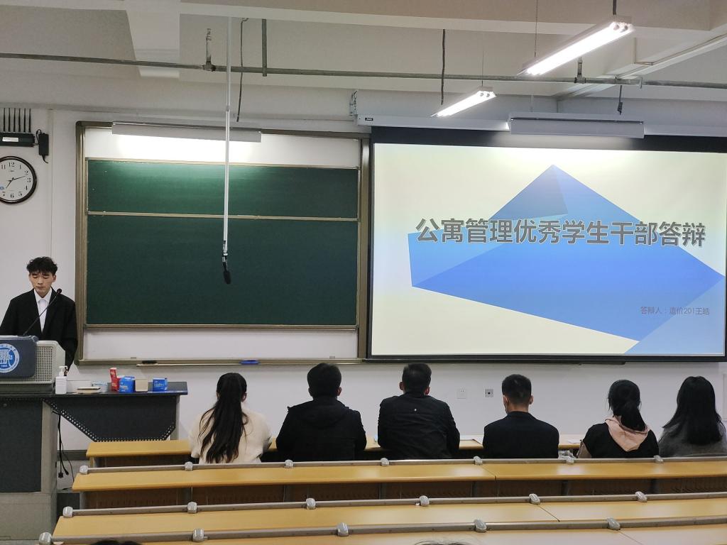 经过初选,来自学院各年级的12个宿舍和8名学生干部进入答辩环节。高鹏磊首先就评分原则、细则、流程,举办答辩的意义及宿舍管理计划做分析。各答辩选手通过PPT围绕思想建设、文明卫生、学习氛围、科技创新、社会实践等方面进行了经验分享展示。物流192班秦文蝶在答辩中提到B8#516宿舍四名同学经过大家的不懈努力,目前三名预备党员,一名发展对象,正朝着全员研究生的目标前进。经过评比,造价202王皓、工管213王静、房产211徐莉茄等同学被评为公寓管理优秀学生干部;B8#516宿舍,D3#511宿舍,D2#617等宿舍被评为星级文明标兵宿舍。高鹏磊做总结发言,他高度评价答辩选手的精心准备与付出,并强调宿舍文明卫生习惯对每个宿舍成员的影响是潜移默化,希望各宿舍长发挥模范引领作用,不断加强学生公寓文化建设,帮助舍友养成良好的生活、学习习惯。