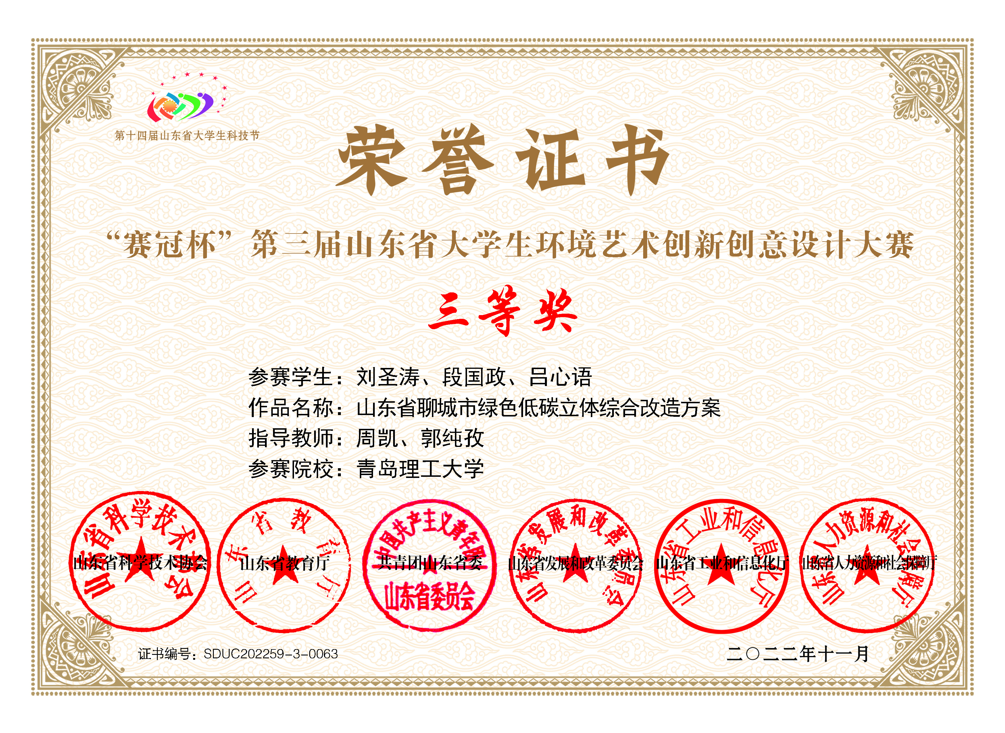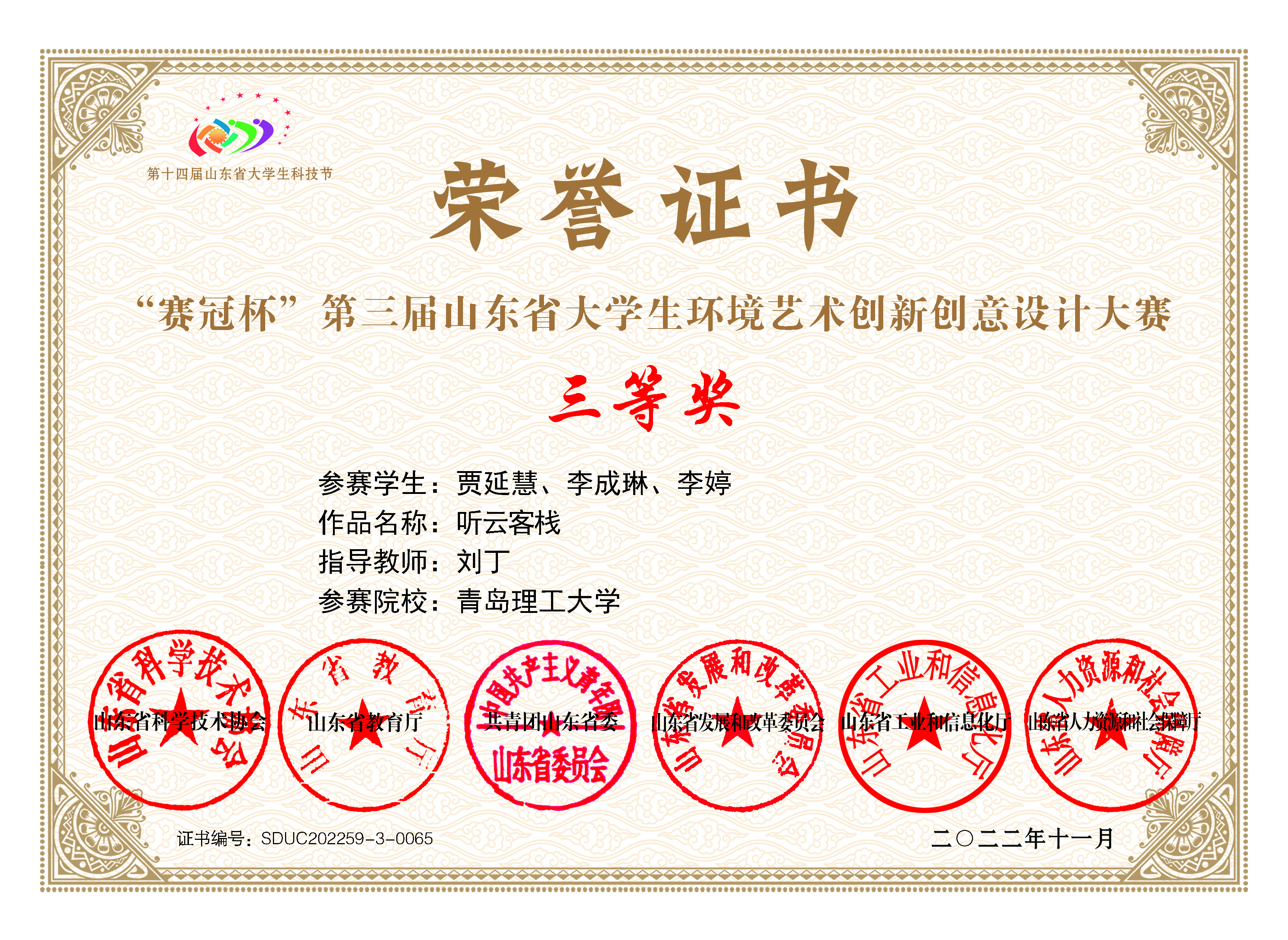 近日,由山东省科学技术协会、山东省教育厅、共青团山东省委、山东省发展和改革委员会山东省工业和信息化厅、山东省人力资源和社会保障厅主办的第十四届山东省大学生科技节--“赛冠杯”第三届山东省大学生环境艺术创新创意设计大赛圆满落幕。管理工程学院“攻防兼备队”(成员:刘圣涛、吕心语、段国政;指导教师:周凯、郭纯孜)获得三等奖,“真正经人队”(成员:贾延慧、李成琳、李婷;指导教师:刘丁)获得三等奖。