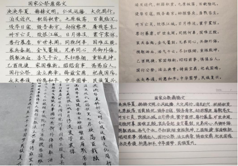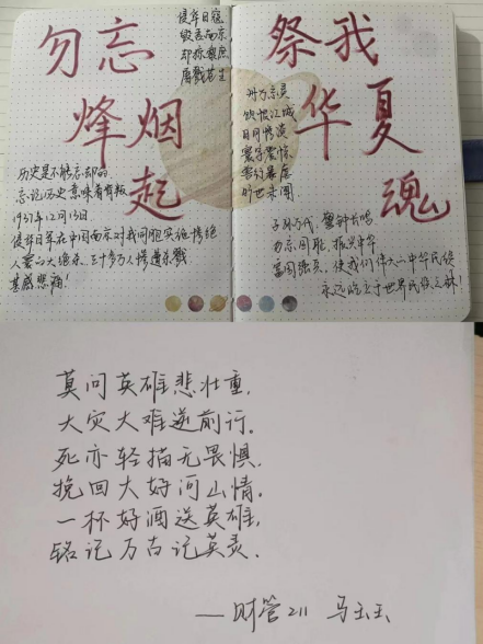 手书铭文汲取力量:商院学子通过手写自我感悟及手书国家公祭鼎铭文表达自己对逝去同胞的缅怀与敬意,同时对牺牲的烈士和逝世的同胞表达哀思和纪念。学生们以笔寄情,通过书写篆刻在国家公祭鼎上的160字铭文,表达自己对30余万遇难同胞的深深悼念以及对“中华圆梦,民族复兴”的期待,将自己的感恩之心与爱国之情融入自己的作品之中,充分展现了商院学子热爱祖国、奋发图强的精神面貌。