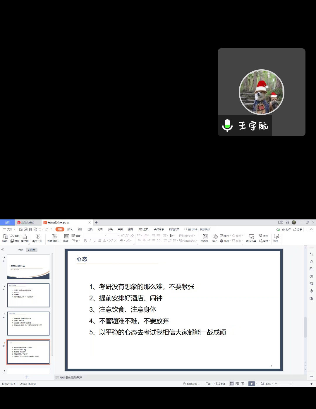 薛腾飞提醒考研学子要多关注自己的焦虑和紧张情绪,尝试“积极的心理暗示”,并为同学们分享了呼吸训练和放松训练两种简单易行的心理调适方法,帮助大家缓解考前压力。陈立波、李宏升从专业的角度为考研学子分析了应试的注意事项,并鼓励考研学子在最后关键时刻保持心神气定、沉着应考、稳扎稳打、坚持到底。高迎澳和王宇航两位同学则从自身经验出发,为大家分析了应试的过程中可能出现的种种困难,并给出针对性建议。活动过程紧凑温馨,干货满满。