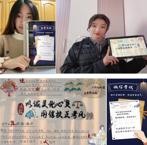 我与考风海报合张影,丰富形式加强考风教育。为加强考风教育,商学院组织举办“塑诚信之风,展学子风采”活动。发布《诚信考试承诺书》,引导学生诚信考试、拒绝作弊。同时鼓励同学们设计制作考风考纪海报、手抄报,并与其合影。“拒绝作弊牢记心间,诚信考试由我先行!”“这样的诚信考试教育很有趣,我也从海报制作过程中了解了考试作弊的处分和危害。”同学们用实际行动参与诚信考试宣传,用朋辈力量对身边同学进行“诚信考试”教育和引导,有效弘扬了良好考试风气。