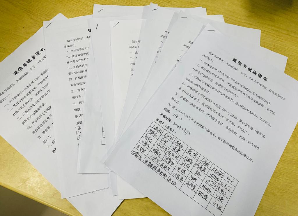 考试是检验学习成果的最好机会和重要手段,它能让学生们正确评价自己,找出学习上的失误和不足,在求学之路上不断进步。作弊不仅是对自己能力的否定和蔑视,更是对学校优良学风的亵渎。为此,学院号召全体学生签署诚信考试承诺书,在承诺书上庄严地签下自己的姓名,在学生意识中拉起一条醒目的红线,以规约引导同学们诚信考试、杜绝作弊。