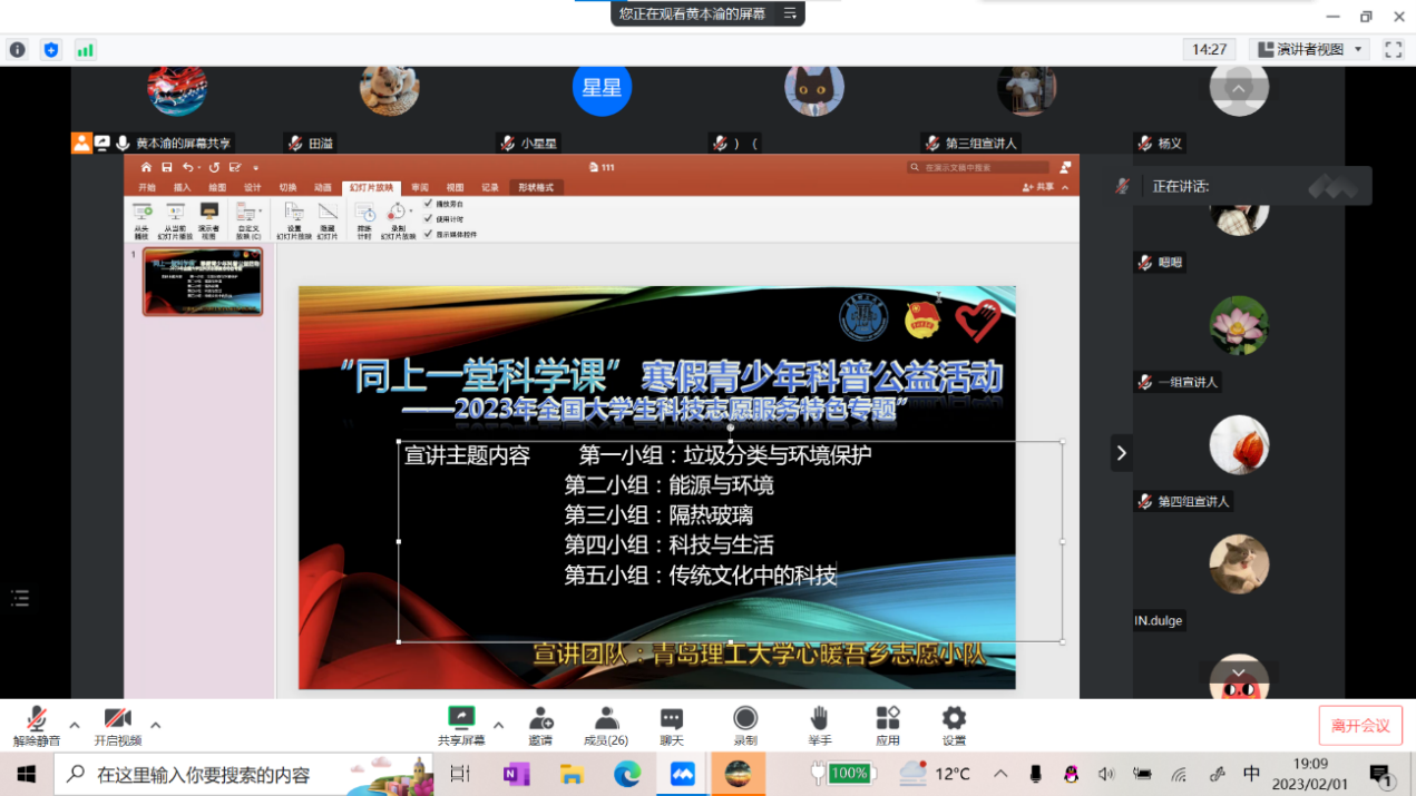 2月1日,“yl7703永利集团心暖吾乡志愿小队”面向青少年儿童开展了线上宣讲。科普的主题包括:垃圾分类与环境保护、能源与环境、隔热玻璃、科技与生活、传统文化中的科技。志愿者们制作精美的演示文档,并充分准备宣讲稿,结合动画视频和有趣的卡通图片,用简单易懂的语言科普知识,为小朋友完成了宣讲。