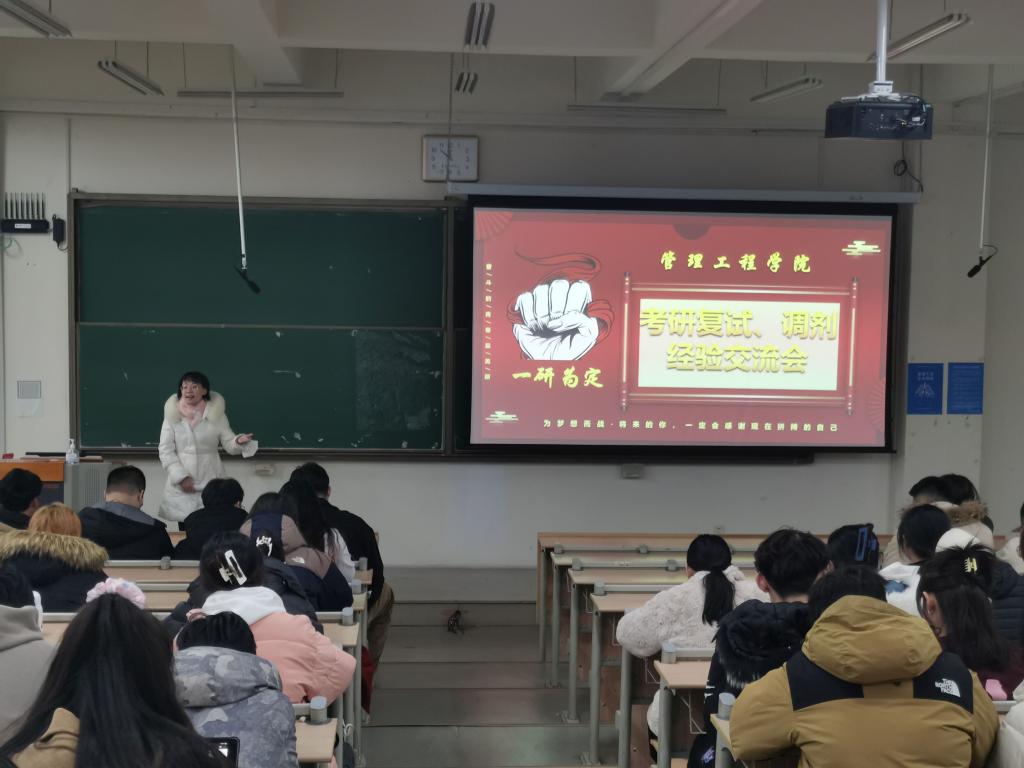 为进一步精准施策、加强考研指导,帮助2023届学生提前做好考研复试、调剂规划准备。2月22日,管理工程学院于主教学楼B529举办考研复试、调剂经验交流会。会议邀请到学院原毕业生辅导员张心怡担任主讲老师,学院毕业生辅导员张冯冯、李佳妮及2023届200余名考研学子参加本次会议。交流会由学院党委副书记王中帅主持。