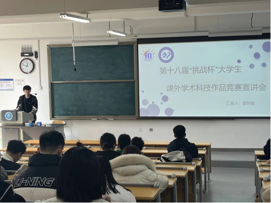 团委科创部负责人翟明鑫对“挑战杯”的赛事分类、赛事规则、选题方向和参赛要求等方面进行了详细介绍,结合历届国赛优秀作品阐述了如何确定作品选题、凝练标题文本、优化项目结构,鼓励同学们提前着手准备,以积极的心态迎接比赛。