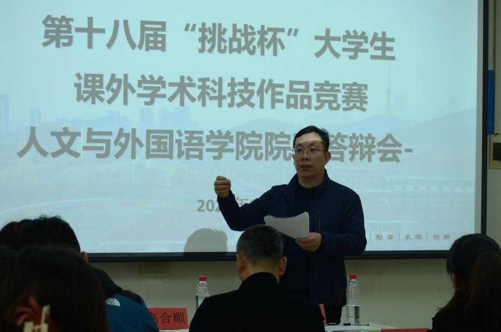 3月9日,人文与外国语学院在主教学楼B307举办第十八届“挑战杯”大学生课外学术科技作品竞赛院赛答辩会。本次答辩会邀请杨书胜、高合顺、金仙玉、高正瀚、刘世颖、曹萌、徐卫晓7名教师担任评委。