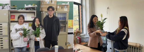 活动中,学生自发将去年认领的绿植送到教师手中,感谢老师们长久以来的辛勤耕耘与谆谆教导,分享自己在培养“绿意”中的喜悦和收获。一株株绿植装点了办公环境,一张张笑脸不断浮现,满满的仪式感传递了师生间浓厚的情谊。