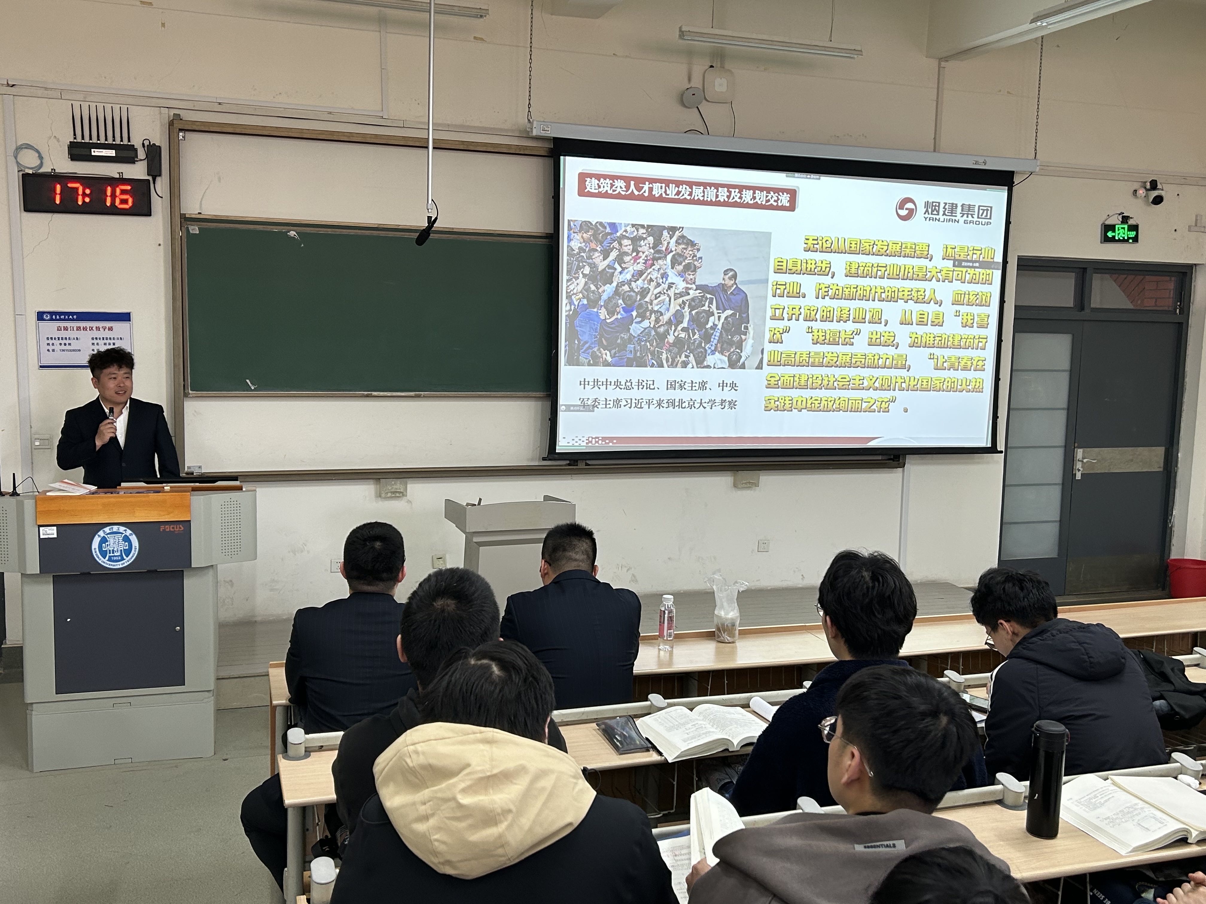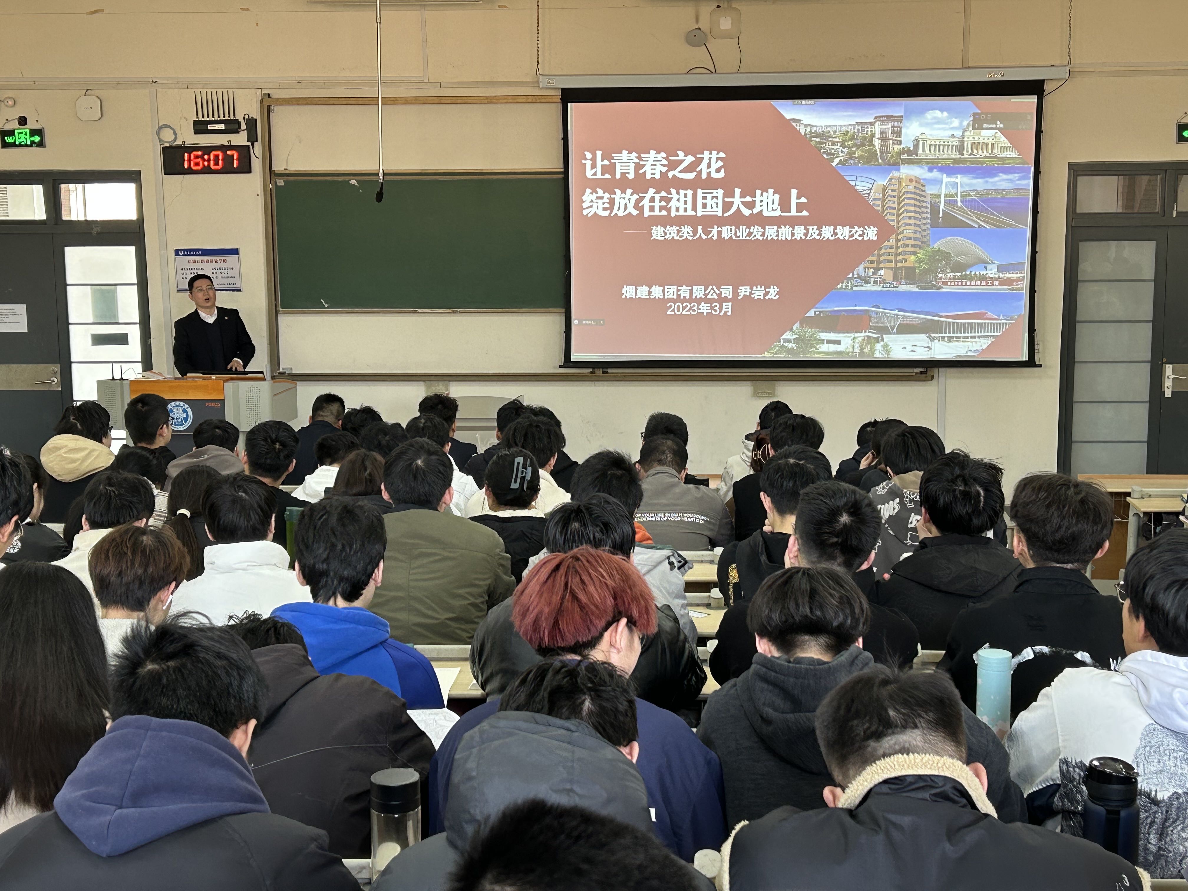 尹岩龙以《让青春之花绽放在祖国大地上——建筑类人才职业发展前景及规划交流》为题,结合十几年从业经历,通过企业案例,从建筑行业的现状及发展、我国施工企业概况介绍、建筑类人才的职业发展等三个方面详尽阐述我国建筑类行业现状及未来发展状况。他表示,中国建筑行业正处于由高速增长向高质量发展的转型升级阶段,只有更准确地把握未来建筑行业发展的方向,才能更好地迎接挑战与机遇。最后,他鼓励同学们,“作为新时代的年轻人,应该树立开放的就业观,从自身‘我喜欢’‘我擅长’出发,为推动建筑行业高质量发展贡献力量。”
