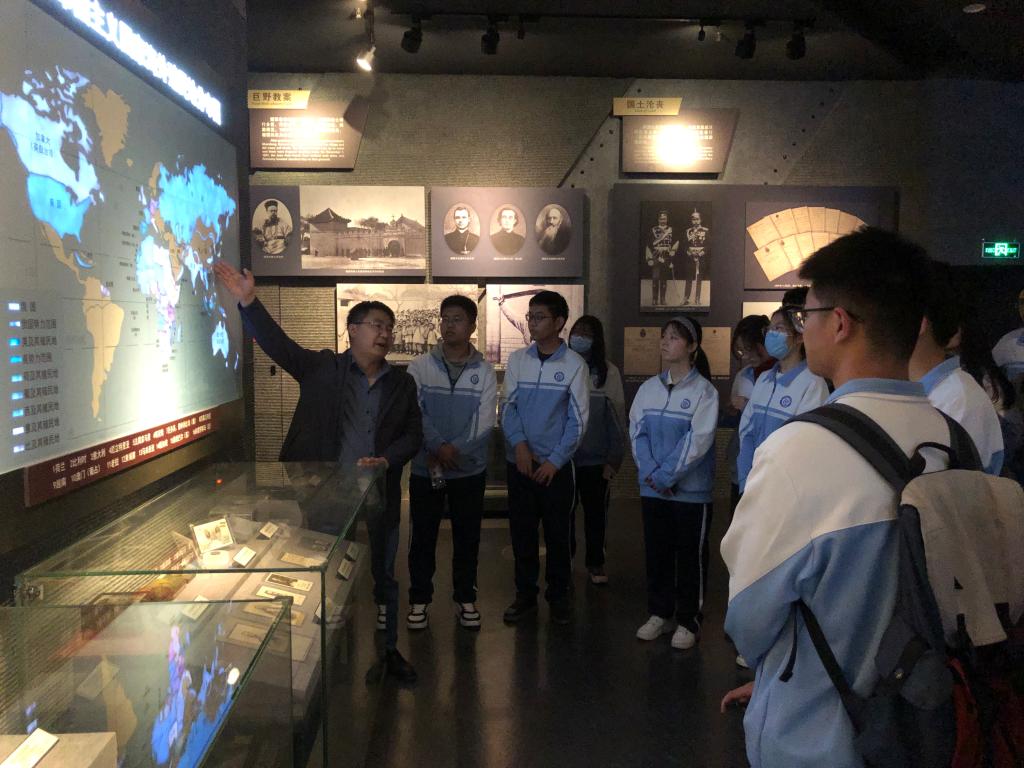 师生们紧接着来到青岛一战遗址博物馆,整个建筑造型像一只展翅飞翔的鸽子,寓意“牢记历史、珍爱和平”,主题展览分为德占青岛、日德战争、苦难归程三个部分,通过大量珍贵文物、档案资料以及运用场景复原、多媒体视频,全面展现一战对中国命运的影响。刘亚鹏老师为同学们讲解了百年青岛的历史变迁和城市面貌变迁,指出“还我青岛”为主题的对外抗争,是中华民族觉醒的起源,是“五四运动”的导火索,开创了反帝反封建的爱国主义运动的新纪元。