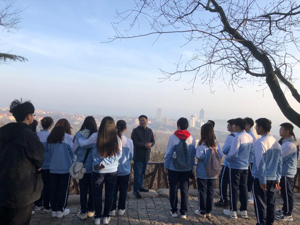 同学们沿着阶梯攀登到山顶,来到德国人留下的一战炮台遗址,俯瞰前海的广阔城市风景,对比之下感触万分。刘老师说:“我们站立的地方,当年德国人将这山底下挖空成地下要塞,在周围山头上布满了炮台,兵戈之声犹在耳,血雨腥风仍可望,我们正在实现民族复兴的伟大理想,我们的祖国正在走向繁荣富强!但是这场血的教训,我辈当以史为鉴,照亮未来!”