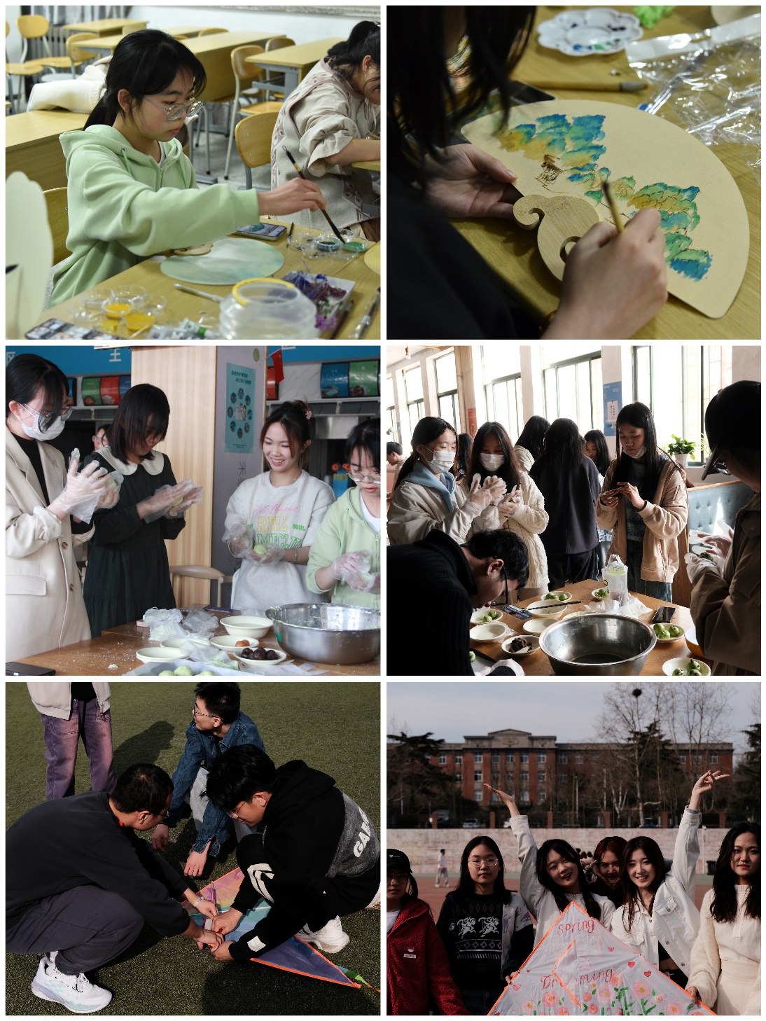 清明习俗“承文化”。为引领同学们追忆清明历史,传承清明优良习俗,开展“尝春”手作青团、手绘团扇、放纸鸢活动,引领学生动手制作,体验民族文化传统。“清明傍青团,遇春亦尝春”,在志愿者的引导下,学生们把拌有艾草汁的糯米粉包裹蛋黄、豆沙等材料,放入锅中蒸煮;“漫谈生活,手绘团扇”,建院学子一笔一画,用颜料在团扇上描绘着万物滋长、山河锦绣,出具有传统特色的团扇;“烟雨过清明,翘首放纸鸢”学生们以班级为单位,挥动画笔、调制颜料,画出精美图案,自己动手组装风筝骨架、风筝线、转轴,制作出具有班级特色的风筝。“尝着亲手做的的青团、精心绘制清明节的团扇、动手组装漂亮的风筝,这些活动让我感受到了中华民族特色的传统习俗的魅力。”建学222班的来秋皓说。学生在体验传统习俗的过程中也陶冶了性情,真正形成“润物细无声”的传承。