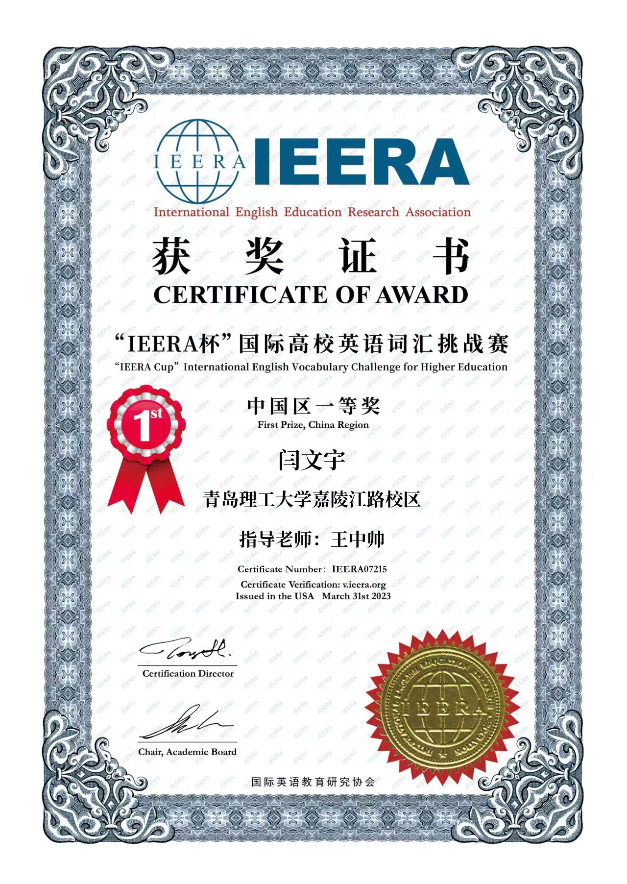 近日,由国际英语教育研究协会(IEERA)主办的“IEERA杯”国际高校英语词汇挑战赛落下帷幕。我校管理工程学院闫文宇同学获得中国区一等奖。