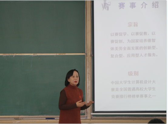 为激发大学生学习计算机知识技能的兴趣与潜能,增进对计算机设计大赛的认识与了解,培养学生的团队合作精神和创新能力,切实提升我院学生的参赛水平和实践能力。4月3日下午,信息与控制工程学院在教学楼B216举办中国大学生计算机设计大赛赛事解读。本次讲座由李兰教授主讲,辅导员张丽主持,信息与控制工程学院110余位学生参加。
