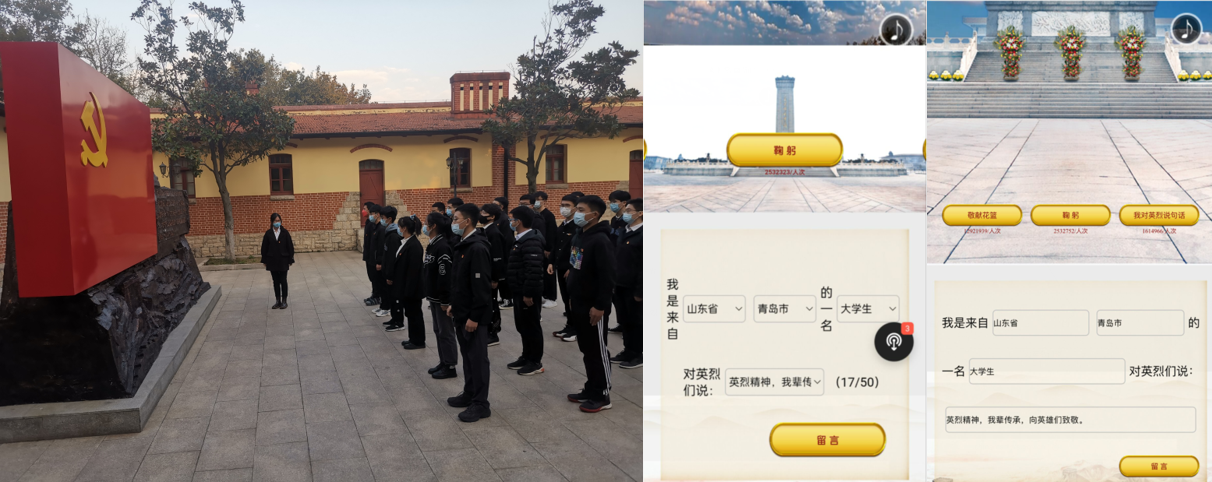 红色故地重游革命精神恒久 学生党支部组织学生党员参观青岛党史纪念馆,了解青岛党组织发展,铭记“五四精神”,学生党员代表在现场重温入党誓词。“我们现在过着和平安宁的生活,是革命前辈们用鲜血和汗水换来的。我们要居安思危,在这个看似和平的时代,更应追寻红色足迹,传承红色精神,为保卫祖国时刻做好准备!”机械197刘春华说。此外,广大学生通过中华英烈网参与线上祭祀,为“最可爱的人”献花。通过绿色环保的英烈祭奠方式,向人民英雄致敬!