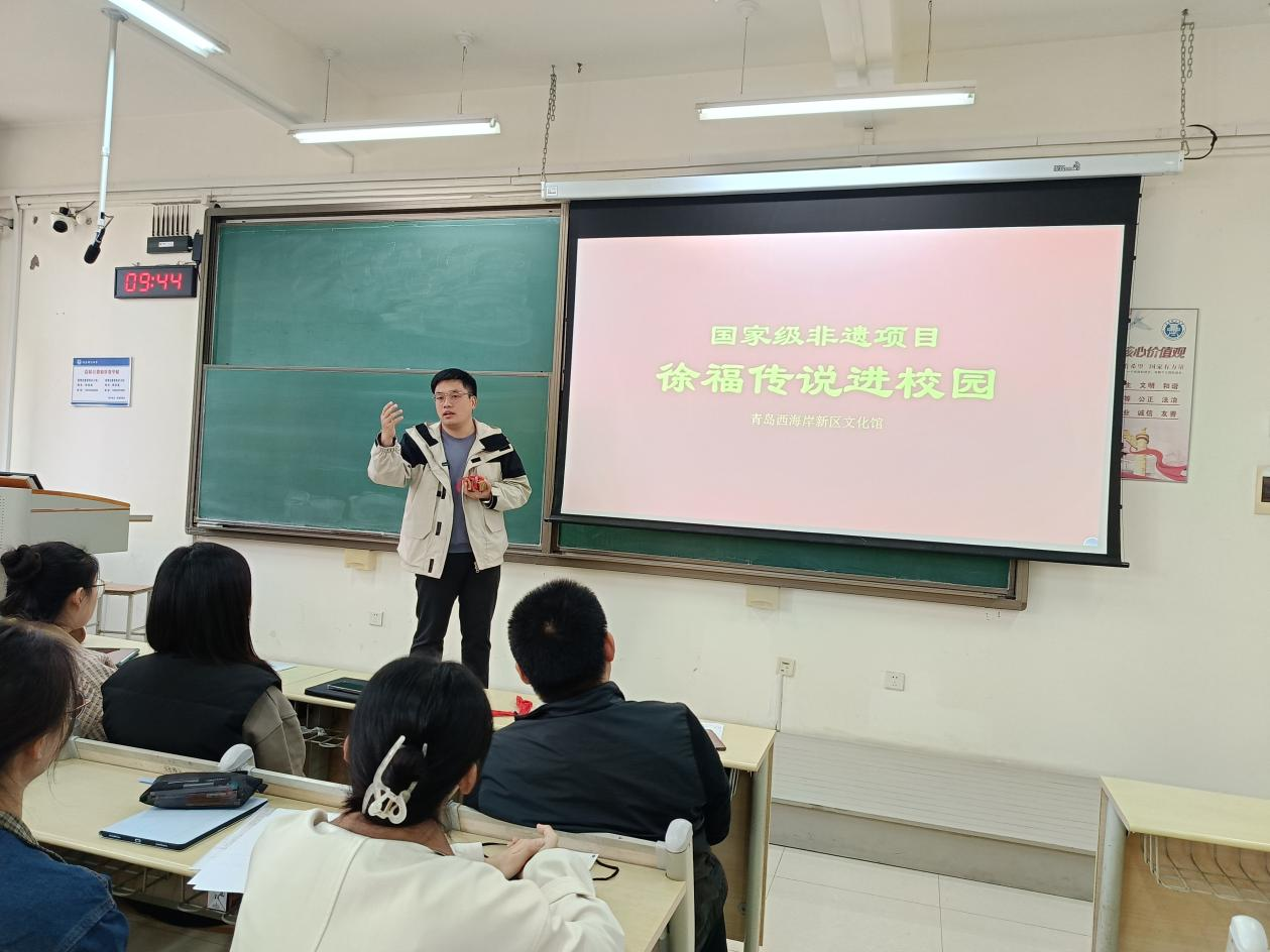 丁盛华老师在宣讲中为同学们分享了“徐福传说”的基本情况以及自己利用所学专业知识传承、传播该项目的过程。他从快板入手,为同学们表演了快板的“开场板”,即兴表演了一段快板来“说唱”徐福传说。丁老师还为同学们播放了快板说唱传播“徐福传说”的短视频,华美的阵容、悦耳的声音、精彩的叙事使同学们目不转睛,加深了对徐福传说的了解。