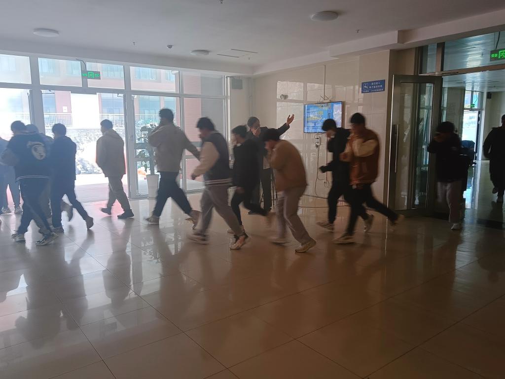随着警铃的响起,一场宿舍火灾的演练拉开帷幕。学院自管会同学高诚发现火情后立刻按下宿舍火灾按钮,同时立即进行上报,启动消防应急疏散预案。指挥组、灭火组、疏散组和救护组等成员,按照分工有条不紊的进行,切断非消防电源、启动消防泵、疏散宿舍学生,工程221班班长臧志泉向老师汇报最后一名同学安全到位后,本次演习圆满结束。