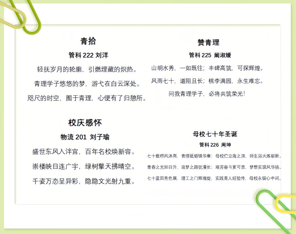 日月如梭,时光流转,七十风雨赓续前行。4月13日至19日,管理工程学院开展“三行纸短,七秩情长”三行校园情诗大赛,以笔为器,以诗为颂,以爱为媒,通过原创诗词、书法展示、信纸设计的形式抒发对学校的热爱思念,为母校七十华诞献礼。