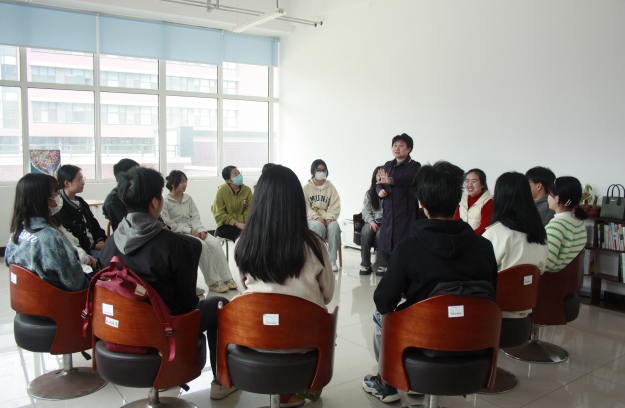 本次团辅活动,杨波围绕“大学生活心语盒”的主题,通过整理学生在大学生活中的多种感受,就毕业之际如何表达与处理离别等情绪与大家进行了深入交流。活动伊始,杨波带领学生体验了事前精心准备的“升级版”小游戏,先让学生起身将手搭在旁边同学的肩上,互道一句“你辛苦了”来缓解紧张情绪。随后,大家跟随音乐同时做“手部操”和“背后接龙”放松身心,在愉快的氛围中熟悉彼此,逐渐融入到集体之中。在现场气氛逐渐活跃时,杨波把握话题方向,引导学生一一分享“大学生活中我最开心的一件事”、“最难忘的一件事”、“最遗憾的一件事”、“最想感谢的一个人及最想对他说的话”,学生们结合日常相关的细节,大胆地表达着心中的爱意、赞美与感激,主动说出藏在内心的烦恼,感受情绪的流淌。通过这种生动自然的互动方式与自我对话、与他人对话、与未来对话,让学生当在面临就业困难、学业困难或者经济困难时能充分地感受到集体的安全感,并从中找到属于自己的节奏,以积极的心态面对未来。