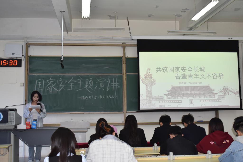 以“讲”叙情,淬炼国安之魂。“山河虽安,但心中不能没有狼烟。”在国家安全主题演讲比赛现场,陈丽翰同学以昂扬的精神,铿锵的话语,讴歌时代、歌颂榜样,围绕总体国家安全观结合自己的所见所闻、所学所思、所悟所感,从多个维度讲述国家安全与每个公民息息相关的深刻内涵。环境与市政工程学院通过组织国家安全主题演讲比赛,引导学生树立正确的总体国家安全观,增强国家安全意识,积极投身国家安全行动。环境与市政工程学院团委书记花会娟表示:“在组织国家安全演讲比赛活动时,我们鼓励学生结合日常生活,以自身感受打开国家安全视角,让学生以演讲的方式体会国家安全的重要性,提高学生们的忧患意识。”