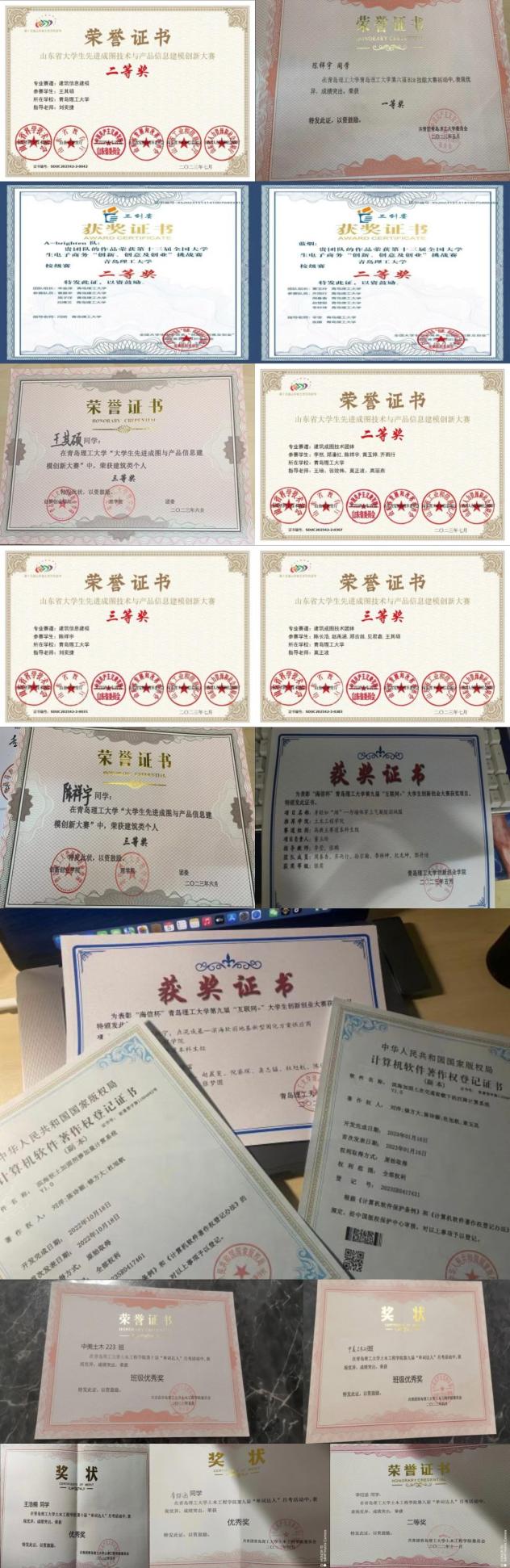 在学科竞赛方面,陈翔宇参加的山东省大学生先进成图技术与产品信息建模创新大赛获得了团队二等奖、个人三等奖,王其硕获得了个人二等奖及团队三等奖,周子洋、吕博文曹晨宇组队参加的“三创赛”荣获校级二等奖,王娅涵参加了互联网+大赛和挑战杯红色专项竞赛等等。