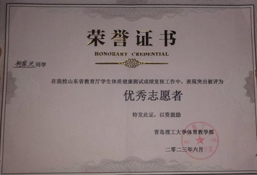 (3)班级成员在省体测志愿者中荣获省体测优秀志愿者。