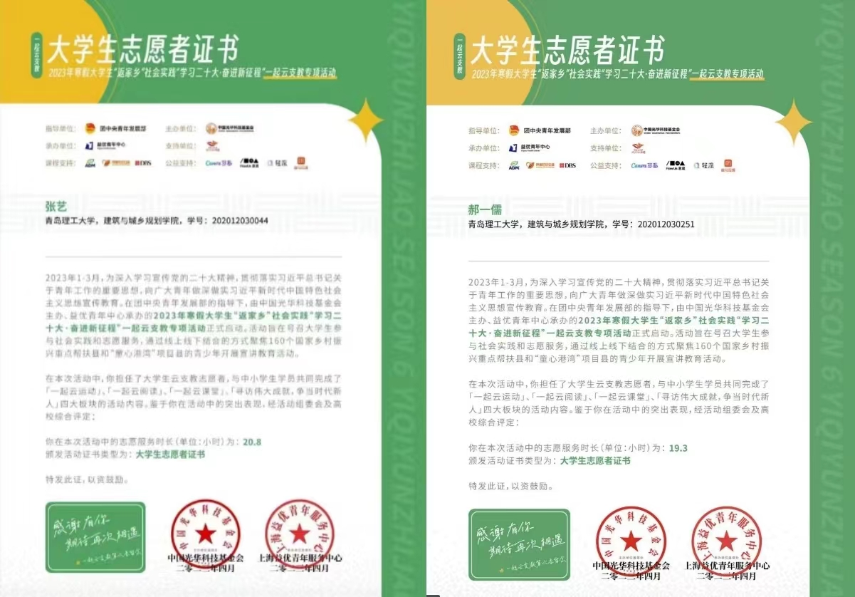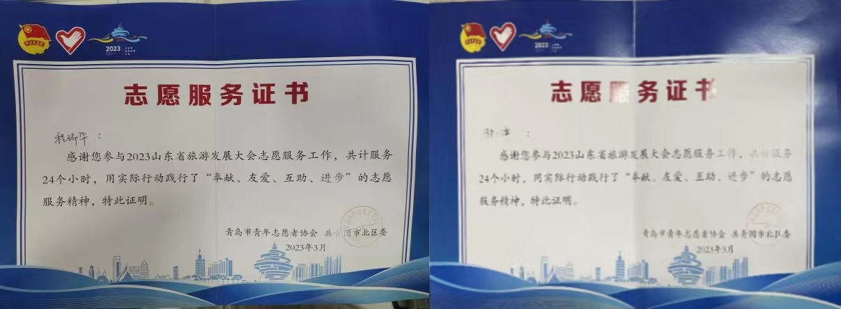 建学202班的同学积极参与市级、省级志愿服务活动,如青岛马拉松活动,各地市的青鸟计划,2023山东省旅游发展大会志愿服务工作、2023年寒假大学生“返家乡”社会实践“学习二十大·奋进新征程”一起云之教专项活动等,并且获得了许多“志愿服务先进个人”的荣誉称号。同学们通过参加社会志愿活动,使内心获得巨大的成长。同学们积极投身到社会服务中,在服务中体会快乐、提升自己、磨练意志,去感知社会生活的万象,在实践中锻炼成才!