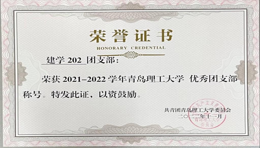 “心专才能绣得花﹐心静才能织得麻”。奋斗是青春最亮丽的底色,行动是青年最有效的磨砺,青春在努力中闪光!2022-2023学年中,在班主任彭振老师和辅导员郑润琪老师的带领下,建学202班全体同学砥砺前行,勇往直前,经学院评选、学校复核,凭借优异的成绩荣获“优良学风标兵班”和“优秀团支部”等多个荣誉称号。