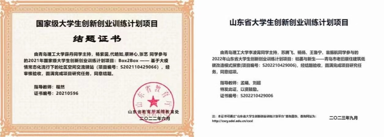 班级同学参与的国际级赛事包豪斯奖共获银奖2枚、铜奖2枚、优秀奖6枚;釜山国际建筑设计工作营取得了第四名的好成绩;在国家级的两岸新锐设计竞赛——华灿奖中取得了1个全国三等奖,2个省级二等奖、3个省级三等奖的好成绩。 “旅投杯”山东省建造设计大赛是2022-2023学年班级参与人数最多的赛事,获奖人数达到13人。班级同学在各赛道均取得不错的成果,其中一个团队是冲破重围,以100进30进7入围了最终决赛,并且成功搭建。