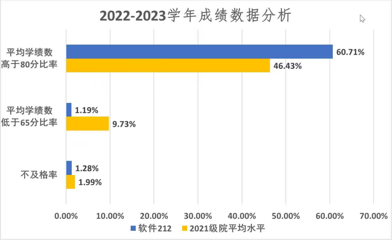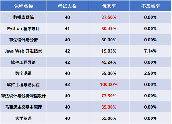 总体来看,2022—2023学年第2学期,班级成绩实现了显著提升,这得益于班级学风建设所产生的积极影响,班级同学充满朝气,已经形成了浓厚的“比学赶帮超”的学习氛围。一些专业课的优秀率超过70%,包括数据库系统、Python程序设计、软件工程导论实验、以及算法设计与分析课程设计。除了个别科目以外,课程不及格率大多数为0%。