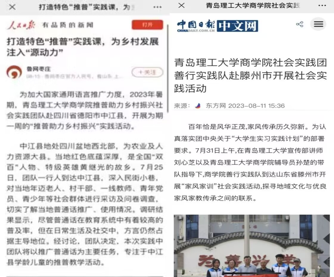 志愿服务暖人心,理工精神永传承。财管222班在2023年暑期“三下乡”社会实践活动中参与率达100%,其中3支实践团队累计获国家级媒体平台报道7次。除此之外,财管222班班级同学志愿服务的身影先后活跃在社区和学校疫情防控、第60届中国高等教育博览会、青岛市马拉松、“返家乡"社会实践“学习二十大•奋进新征程”一起云支教、学校70周年校庆等诸多国家级、地市级和校级的志愿服务岗位上,班级同学累计志愿服务近80人次2000余小时。心怀家国、脚踏热土,班级同学在川东山区推普支教、在墨子故里传承调研、在“醉美贵州”记录感悟古老苗族村落非遗之美……在一次次社会实践与志愿服务中实现自我成长。