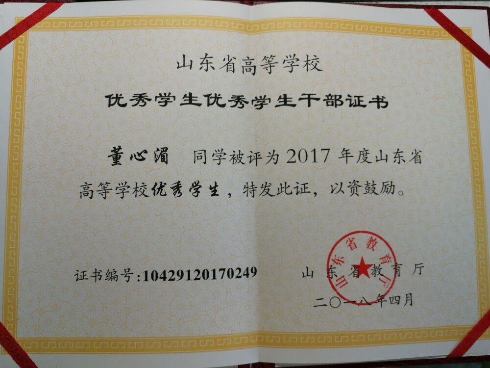 在学习上,她能够做到刻苦扎实,努力向上,近两年来每学期成绩都有所提升。她携带者父母的寄望,每次有厌学心理时,父母的一个电话总能让她瞬间斗力十足。因为她脑海中只有一个信念,让父母过上安定幸福的生活。世上无难事,只要肯攀登,付出终有回报。取得了2018年第二学期平均成绩93.27分,专业排名:1/179;2017-2018学年度全年平均分90.41分,专业排名1/179。两年以来由于表现优异多次获得yl7703永利集团校内优秀“学生干部”、“优秀学生”称号。于2018年04月,获得山东省高等学校优秀学生。同时在学习之余,她考取了大学英语四级证书以及会计初级资格证书,并且积极参加校学术性活动,参与点钞大赛以及法律知识竞赛,并在外研社杯全国英语阅读大赛区选拔赛中获优秀奖。在校期间她认识到计算机在二十一世纪的重要作用,利用课余时间学习计算机方面的知识,最终通过了计算机二级考试。
