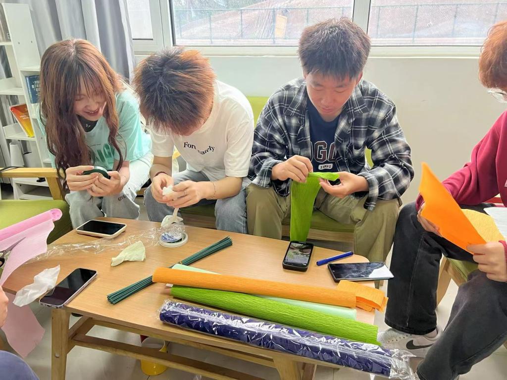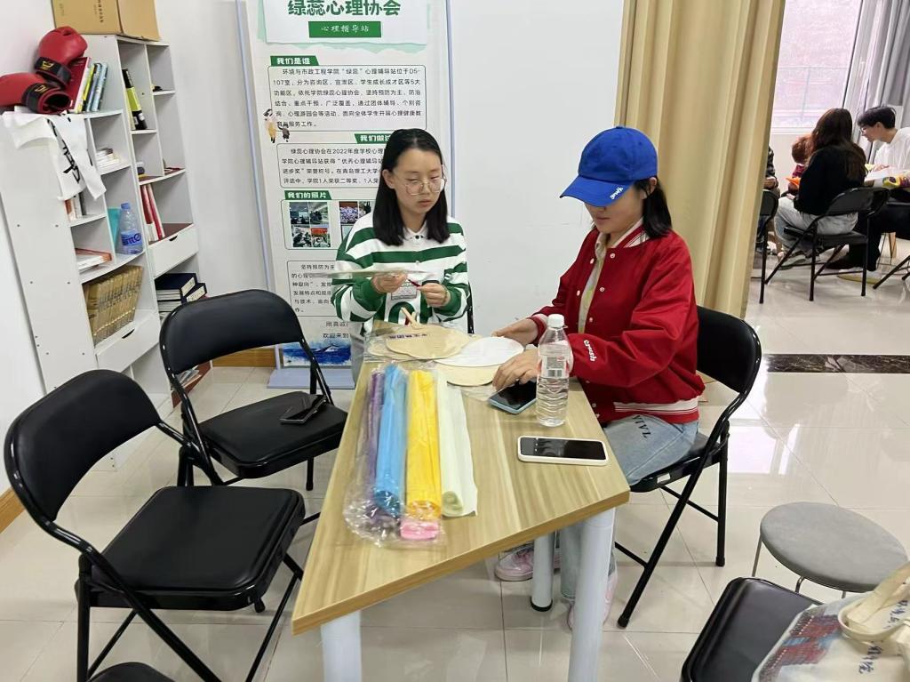 为塑造健全人格,丰富精神生活,促进同学们的身心全面健康发展,环境与市政工程学院绿蕊心理协会于5月21日下午在心理活动室开展以“剪纸”、“团扇”、“纸艺花”为代表的心理美育活动。同学们通过制作传统手工艺品,提高审美能力和动手能力,促进心理健康。