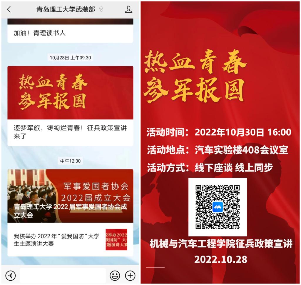 机械与汽车工程学院高度重视大学生征兵工作,不断创新宣传工作方法,丰富国防教育内容,多措并举积极引导鼓励学生响应国家号召,应征入伍,报效祖国。