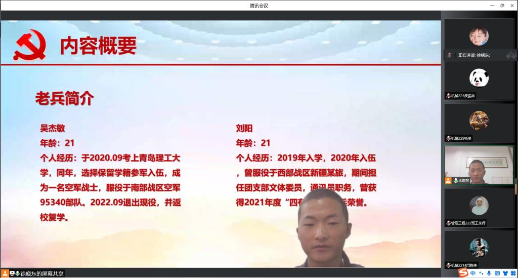 为做好2023年征兵宣传工作,鼓励大学生逐梦军旅,铸绚烂青春,进一步提升大学生国防安全意识。10月30日下午,机械与汽车工程学院开展“心系国防,共筑长城”国防教员宣传活动。学院党委副书记董虎、2019级辅导员徐晓东、退伍复学学生代表及在校生300余人参加线上线下同步交流。学院党委副书记董虎结合我院参军入伍优良传统,希望广大青年学生增强国家安全意识,自觉维护国家安全,做有理想、有担当的有为青年。