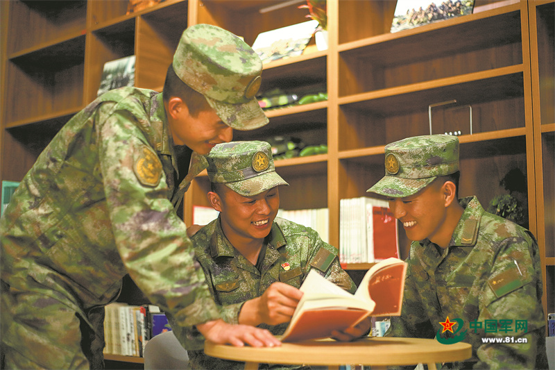(陈灵(中)向战友们分享读书心得)