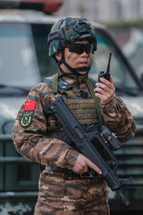 武警河北总队某部大队长李闯在演练中下达任务指令(2021年3月4日摄)。新华社发(张丹 摄)