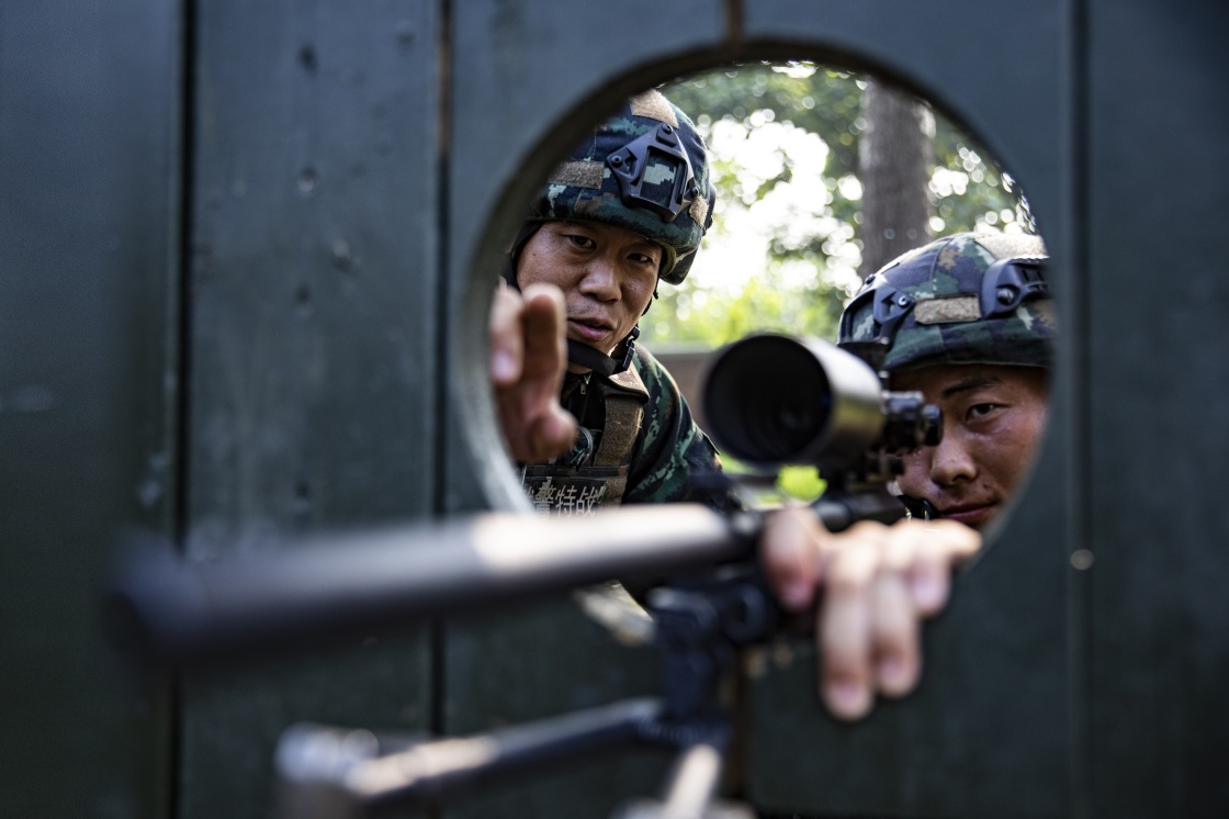 武警河北总队某部大队长李闯(左)指导特战队员狙击训练(2022年8月3日摄)。新华社发(江腾 摄)