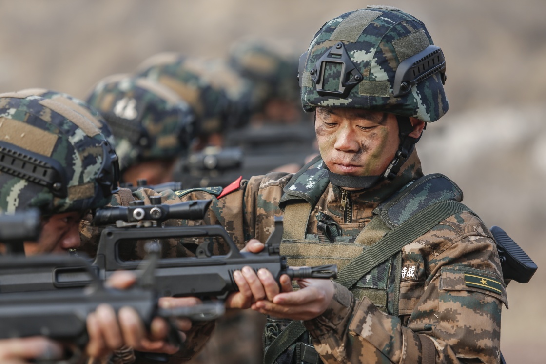 武警河北总队某部大队长李闯组织特战队员进行据枪训练(2021年3月4日摄)。新华社发(张丹 摄)
