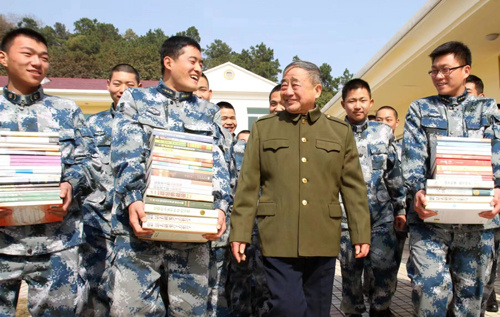 代表“老战士报告团”向官兵赠送书籍。