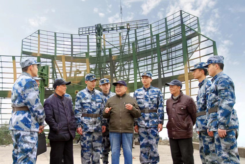 在空军某雷达站毛兰成(右五)和"老战士报告团"成员一起宣讲党的创新理论。