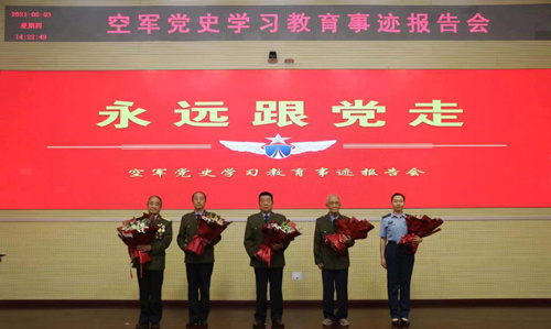 毛兰成(左一)与"老战士报告团成员"一起,给人民空军全体官兵上网课后的合影。